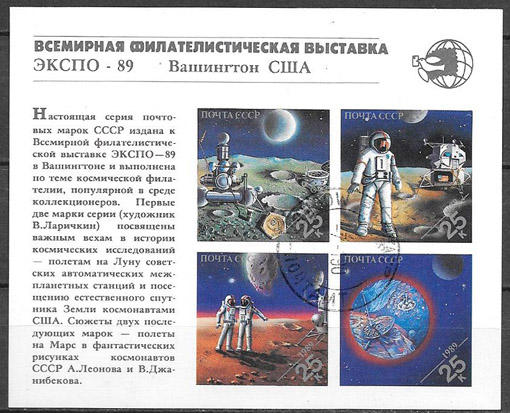 СССР 1989 год. Космос. Всемирная филателистическая выставка "Экспо-89" (Вашингтон). 1 гашеный блок