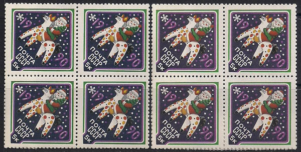 СССР 1989 год. С Новым 1990 годом! Квартблок. Разновидность - темный фиолетовый цвет на левом квартблоке