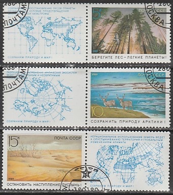 СССР 1989 год. Сохраним природу и мир! 3 марки с купонами, № 5973-75 (гашёные)