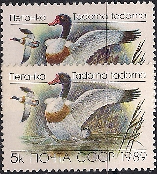СССР 1989 год. Утки. Пеганка (ном. 5к). Разновидность - разный цвет, фон