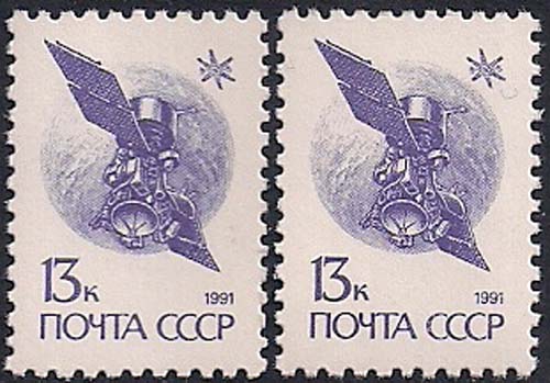 СССР 1991 год. Спутник связи "Горизонт". Белый и желтый клей. 2 марки