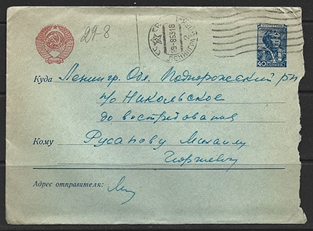 Стандартный конверт прошел почту 1953 год, марка № 1386 40 копеек