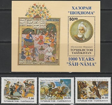 Таджикистан 1993 год. 1000 лет поэме А. Фирдоуси "Шахнаме", 3 марки + блок