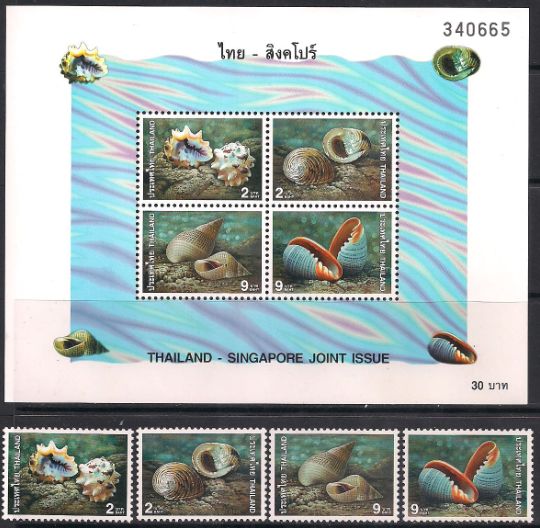 Таиланд 1997 год. Морские раковины. 4 марки блок. НАКЛЕЙКИ