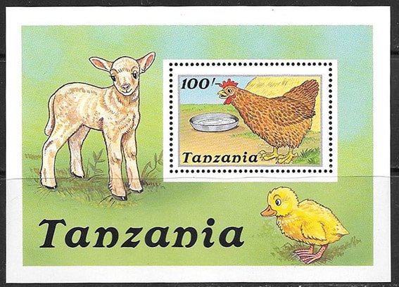 Танзания 1988 год. Домашние животные. Курица, цыпленок, овечка, блок