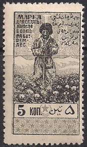 Ташкент 1925 год. Непочтовая марка для уплаты взносов союза работников "ЗЕМЛЕС", 5 копеек, с наклейкой