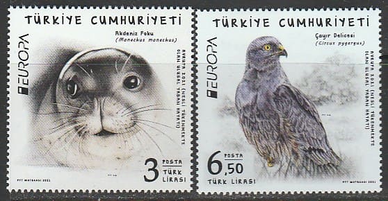 Турция 2021 год. Вымирающие виды: белобрюхий тюлень и луговой лунь, 2 марки.