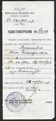 Удостоверение. Латв. ССР Министерство Внутренних Дел, Отдел Кадров, 1948 г.