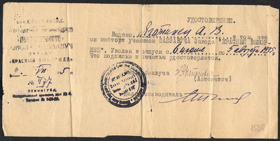Удостоверение об отпуске. Завод Красный Выборжец, 1935 год