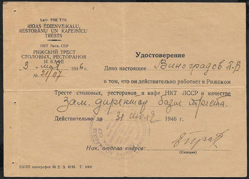Удостоверение. Рижский трест столовых, ресторанов и кафе 1946 г.