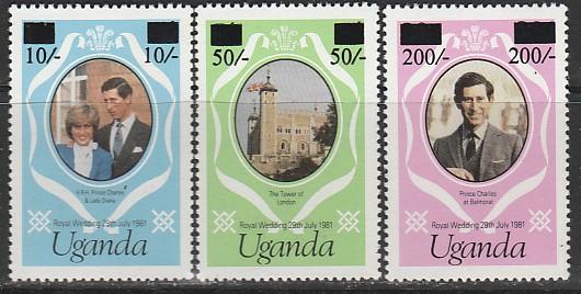 Уганда 1981 год. Свадьба принца Чарльза и леди Дианы, 3 марки с надпечаткой