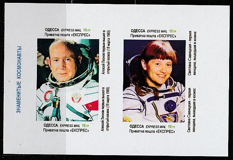 Украина (Одесса) Космонавты: Алексей Леонов и Светлана Савицкая, б/зубц. квартблок марок экспресс-доставки