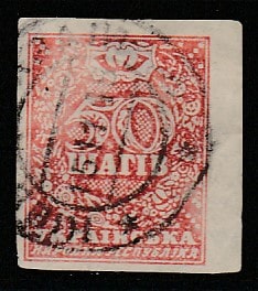 Украинская Народная Республика (УНР) 1918 год. Номинал, обрамлённый растительным орнаментом с 2 почтовыми рожками, ном. 50 ш.,1 марка (гашёная)