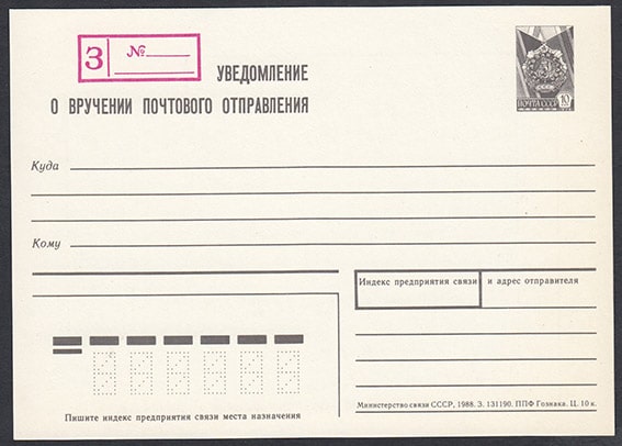Уведомление о вручении почтового отправления, заказное, 10 коп, 1988 год