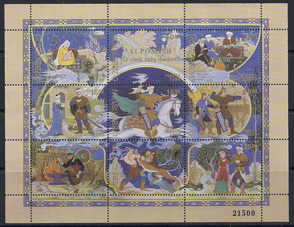 Узбекистан 1998 год. Узбекский эпос "Алпомыш". 1 малый лист