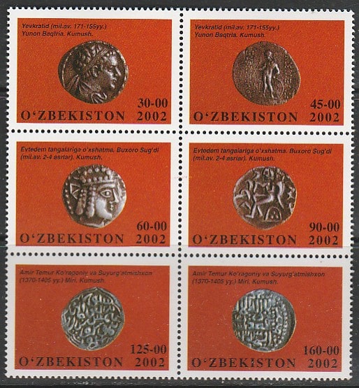 Узбекистан 2002 год. Старинные монеты, 6 марок (сцепка)