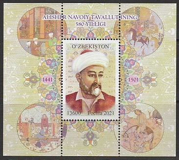 Узбекистан 2021 год. 580 лет со дня рождения Алишера Навои, блок (н