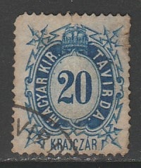 Венгрия 1873 год. Телеграфная марка. Номинал 20 крейцеров и корона, 1 марка (гашёная)