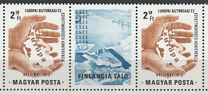 Венгрия 1973 год. Конференция по безопасности и сотрудничеству в Европе, Хельсинки, 2 марки с купоном в сцепке