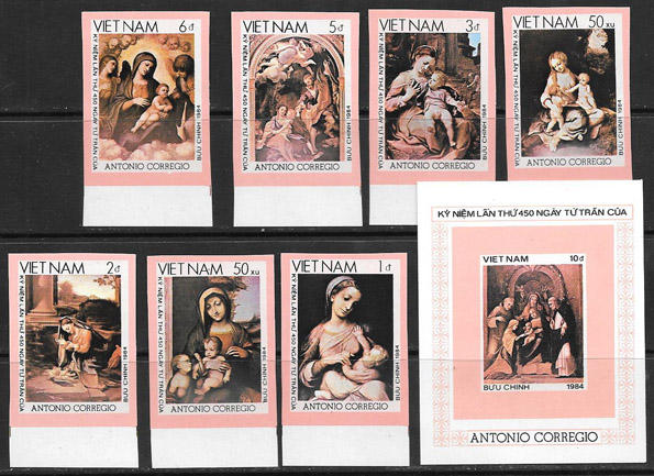 Вьетнам 1984 год. 450 лет со дня смерти итальянского художника Корреджо. Картины, искусство. 7 беззубцовых марок + блок.