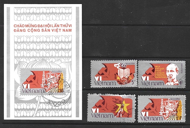 Вьетнам 1986 год. 6-й конгресс коммунистической партии Вьетнама. 4 гашеные марки и блок