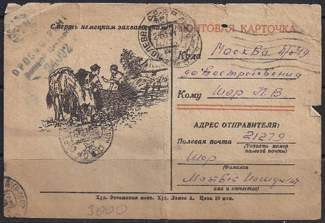 Воинское письмо "Смерть немецким захватчикам!" 23.11.1944 год, гашение полевой почты (ю)