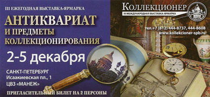 Так же в каждом номере подарок! Пригласительные билеты на две персона на III Международную выставку-ярмарку "Антиквариат и предметы коллекционирования", которая будет проходить 2-5 декабря в ЦВЗ "Манеж" по адресу: Исаакиевская пл., 1