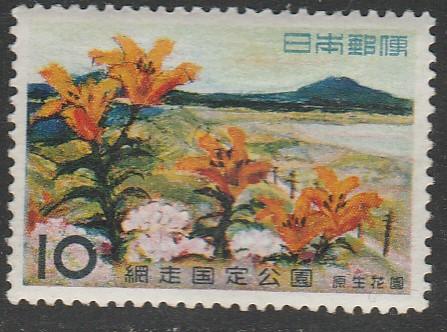 Япония 1960 год. Национальный парк "Абасири", 1 марка с наклейкой