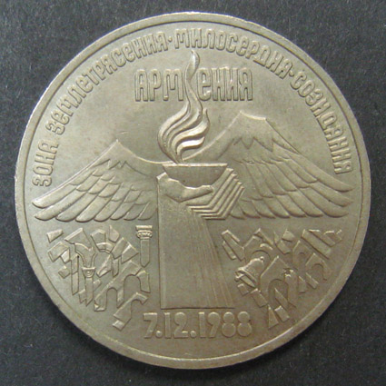 Юбилейная монета. Зона землетрясения. Милосердия. Созидания. 7.12.1988 г. 3 рубля. 1989 г.