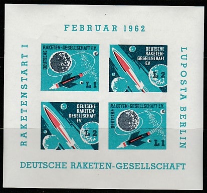 Западный Берлин 1962 год. Немецкое ракетное общество. Пуск ракеты, б/зубц. блок (непочтовый) (I)