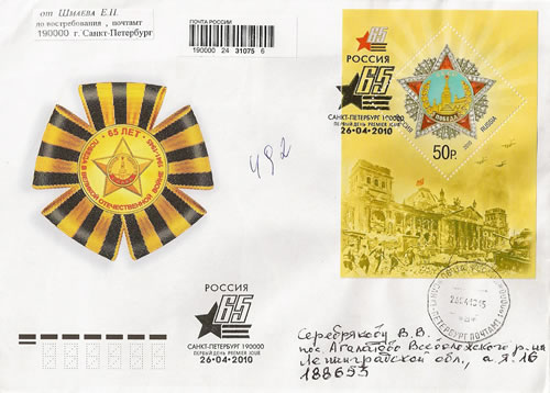 В г. Санкт-Петербурге на Главпочтамте (Почтамтская ул., д. 9) 26.04.2010 г. прошло спецгашение блока выпущенного к 65-илетию Победы в Великой Отечественной войне.
